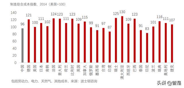一是中国制造综合成本的相对优势正逐渐变小。除用工成本外,能源使用成本、土地成本、 融资成本都在不断上涨。波士顿咨询曾比较 25 家出口经济体的制造业成本指数显示,中国 制造业综合成本已与美国基本相当。