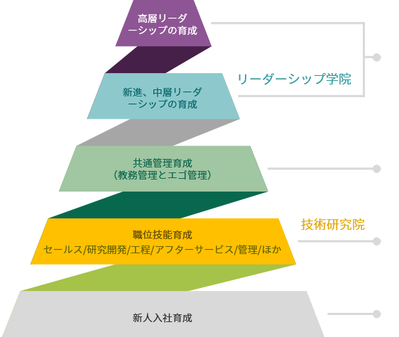 専門的なキャリアの双通路プラットフォームを作り、社員を育成するうえで、多能工も育成する。違う職位でも同じ昇進チャンスを持つように。
